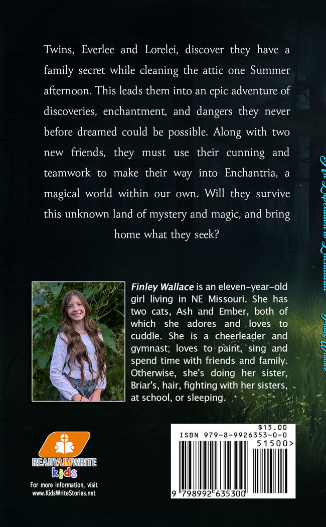 Twins, Everlee and Lorelei, discover they have a family secret while cleaning the attic one Summer afternoon. This leads them into an epic adventure of discoveries, enchantment, and dangers they never before dreamed could be possible. Along with two new friends, they must use their cunning and teamwork to make their way into Enchantria, a magical world within our own. Will they survive this unknown land of mystery and magic, and bring home what they seek?