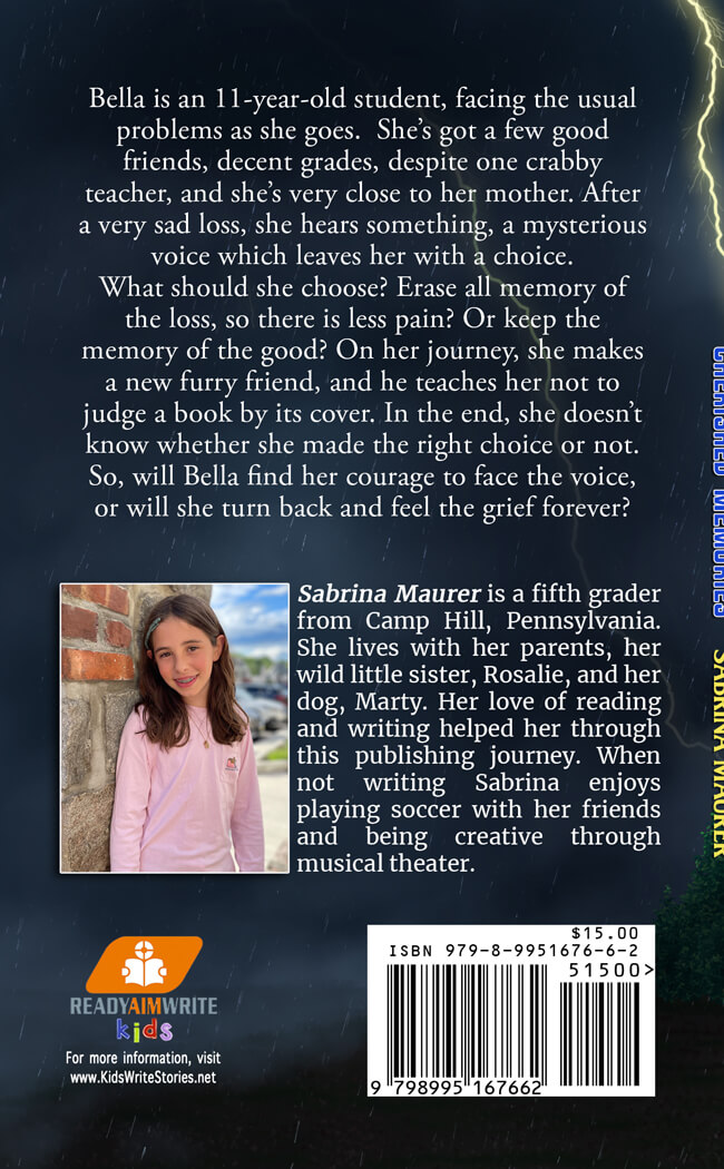 Sabrina Maurer is a fifth grader from Camp Hill, Pennsylvania. She lives with her parents, her wild little sister, Rosalie, and her dog, Marty. Her love of reading and writing helped her through this publishing journey. When not writing Sabrina enjoys playing soccer with her friends and being creative through musical theater.