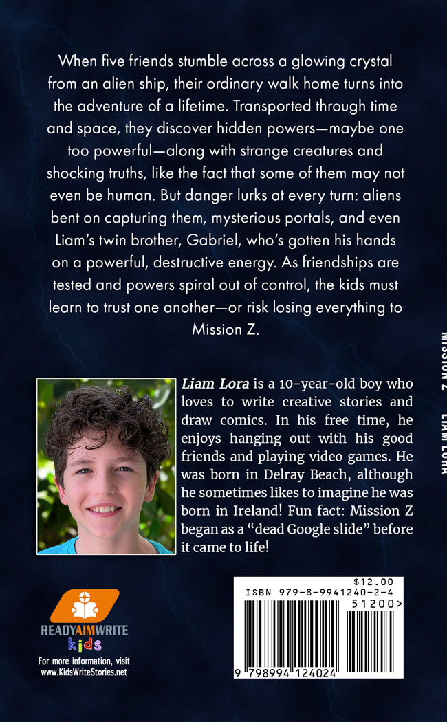 When five friends stumble across a glowing crystal from an alien ship, their ordinary walk home turns into the adventure of a lifetime. Transported through time and space, they discover hidden powers—maybe one too powerful—along with strange creatures and shocking truths, like the fact that some of them may not even be human. But danger lurks at every turn: aliens bent on capturing them, mysterious portals, and even Liam’s twin brother, Gabriel, who’s gotten his hands on a powerful, destructive energy. As friendships are tested and powers spiral out of control, the kids must learn to trust one another—or risk losing everything to Mission Z.