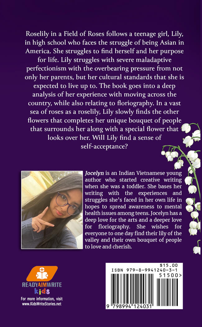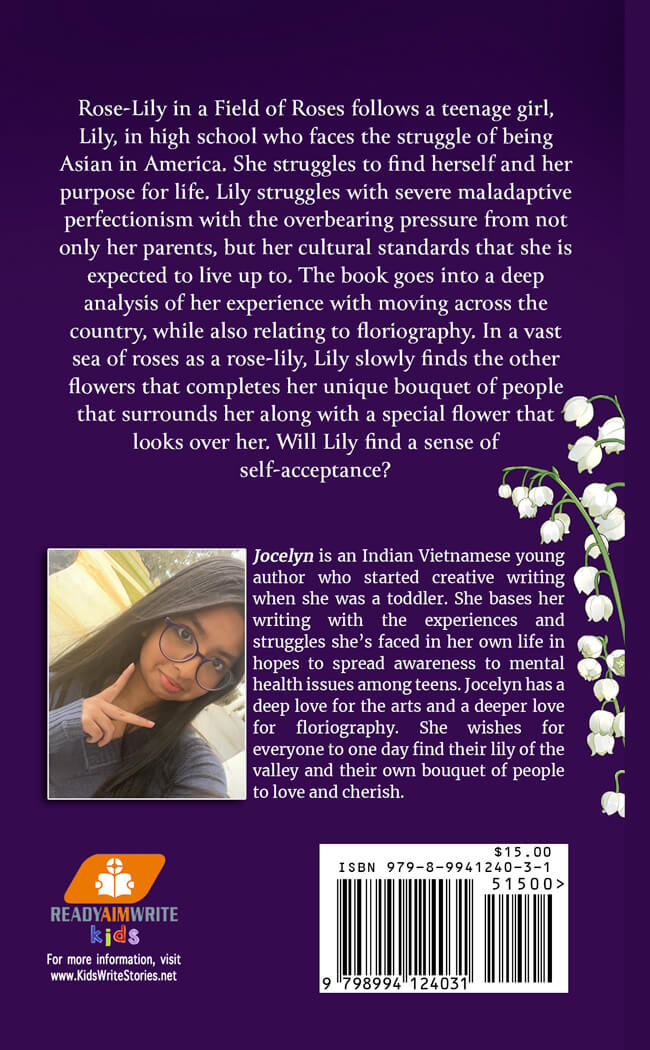 Rose-Lily in a Field of Roses follows a teenage girl, Lily, in high school who faces the struggle of being Asian in America. She struggles to find herself and her purpose for life. Lily struggles with severe maladaptive perfectionism with the overbearing pressure from not only her parents, but her cultural standards that she is expected to live up to. The book goes into a deep analysis of her experience with moving across the country, while also relating to Floriography. In a vast sea of roses as a rose-lily, Lily slowly finds the other flowers that completes her unique bouquet of people that surrounds her along with a special flower that looks over her. Will Lily find a sense of self-acceptance?